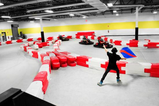 After lunch, we got back in the car and headed for Thunderbolt Indoor Karting for some go-kart racing. This place is amazing!! It has a small arcade, party room, and this massive track. The karts can go up to 45 miles per hour! We paid for one race, which is 16 laps. This is a serious track — Closed-toed shoes, racing helmets, and neck braces. It was awesome! Drew won our race. Justin was second, I was third, and Al was fourth. It was a blast! There was even a three-level podium where you could pose for pictures! For more info, check them out on Facebook.