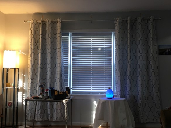 I don’t have a current photo to share, but we finally got rid of the old curtain rods and ugly brown fabric! We have proper blinds now, like the rest of the house. Woohoo!