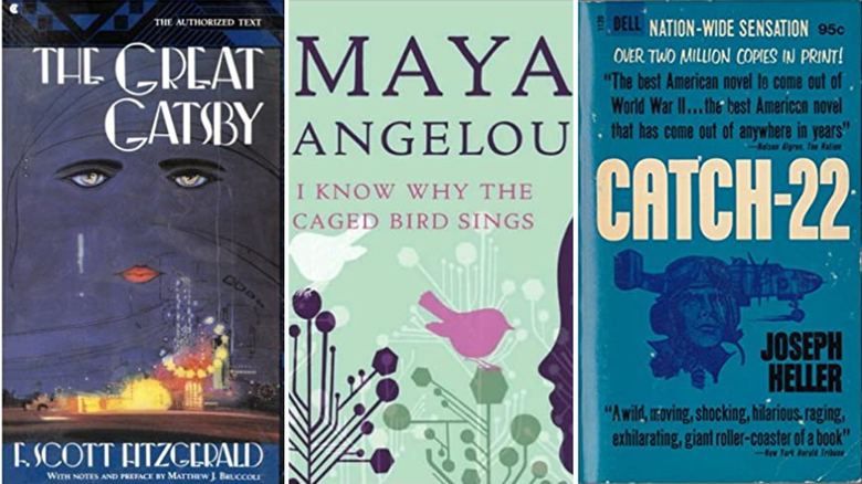 The books that are under fire in the town of Palmer are F. Scott Fitzgerald’s The Great Gatsby; Ralph Ellison’s Invisible Man; Joseph Heller’s Catch-22; Tim O’Brien’s The Things They Carried; and Maya Angelou’s I Know Why The Caged Bird Sings.